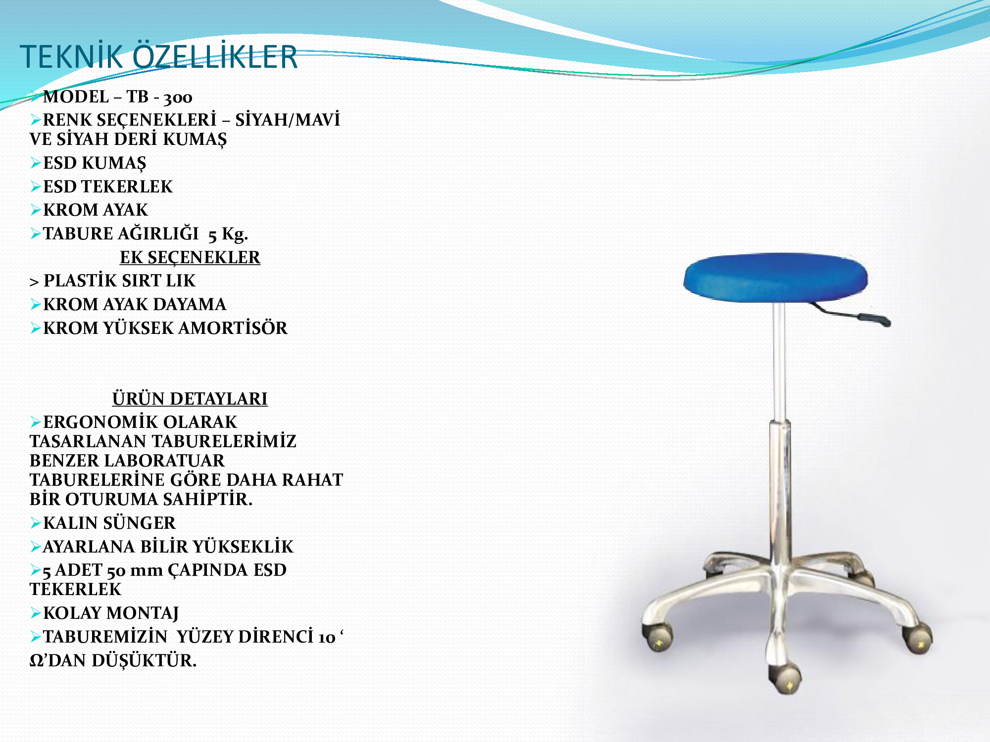 TABURELERİMİZİN YÜZEY DİRENCİ 10 ‘ Ω’DAN DÜŞÜKTÜR.